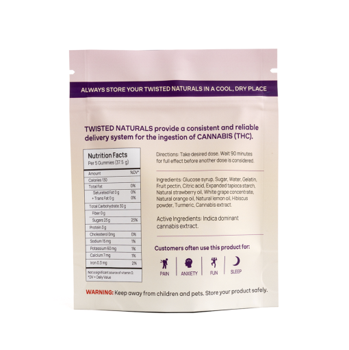 You’ll find 12 x 100mg Twisted Naturals gummies in each bag of High Dose Twisted Naturals.